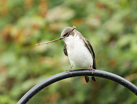 Common Grackles, Starlings, and American Robins are flying through the neighborhood with mouthfuls of food for chicks. The Tree Swallow at the house laid her first egg yesterday afternoon and continue to copulate throughout the day. She only took a few days to build the nest out of materials she found in the yard and street.